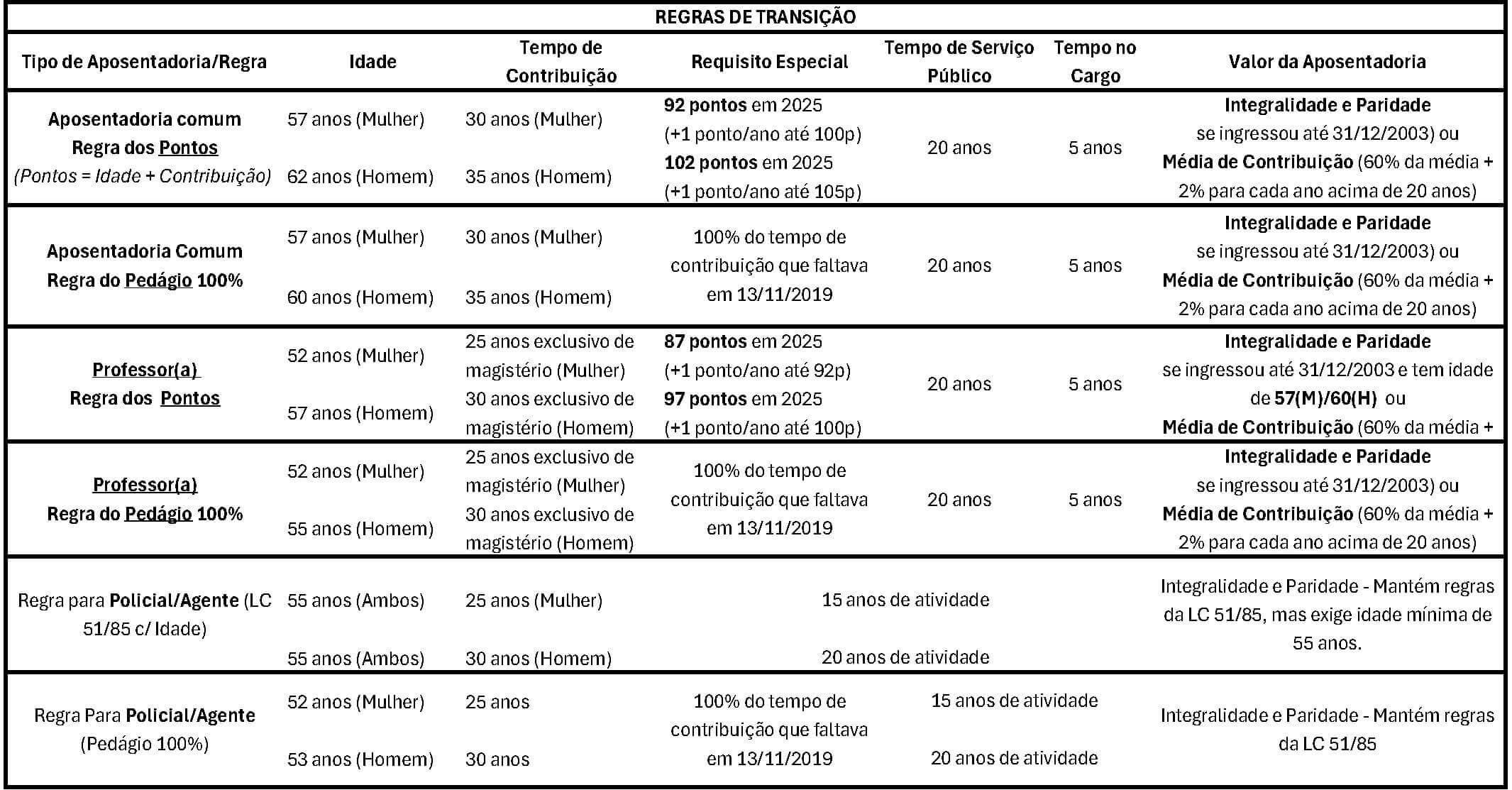 Mesmo para os servidores que ainda são regidos pela legislação anterior (EC 41/2003), a emenda anterior já previa diversos critérios e regras de transição (pedágio, pontos, idades diferenciadas, etc.) que trazem tipos de benefícios diferentes a depender do critério utilizado, dependendo, portanto, de enquadramento e análise específica.